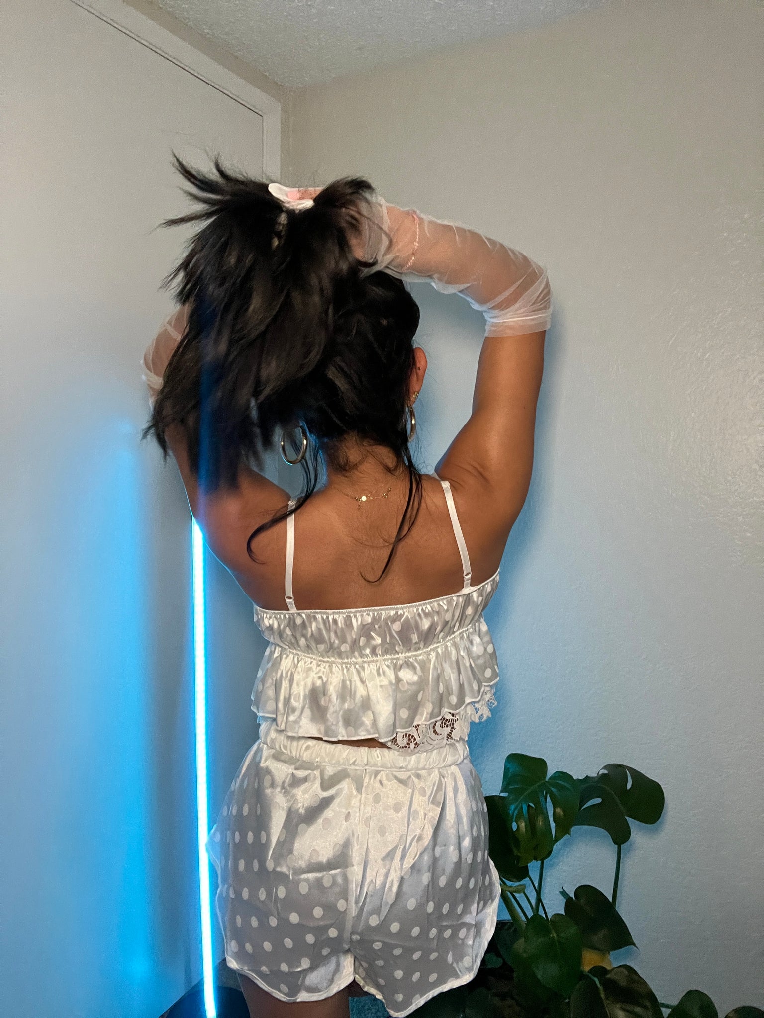 A white cami and shorts lounge set. Satin set with adjustable straps and layered lace trims.